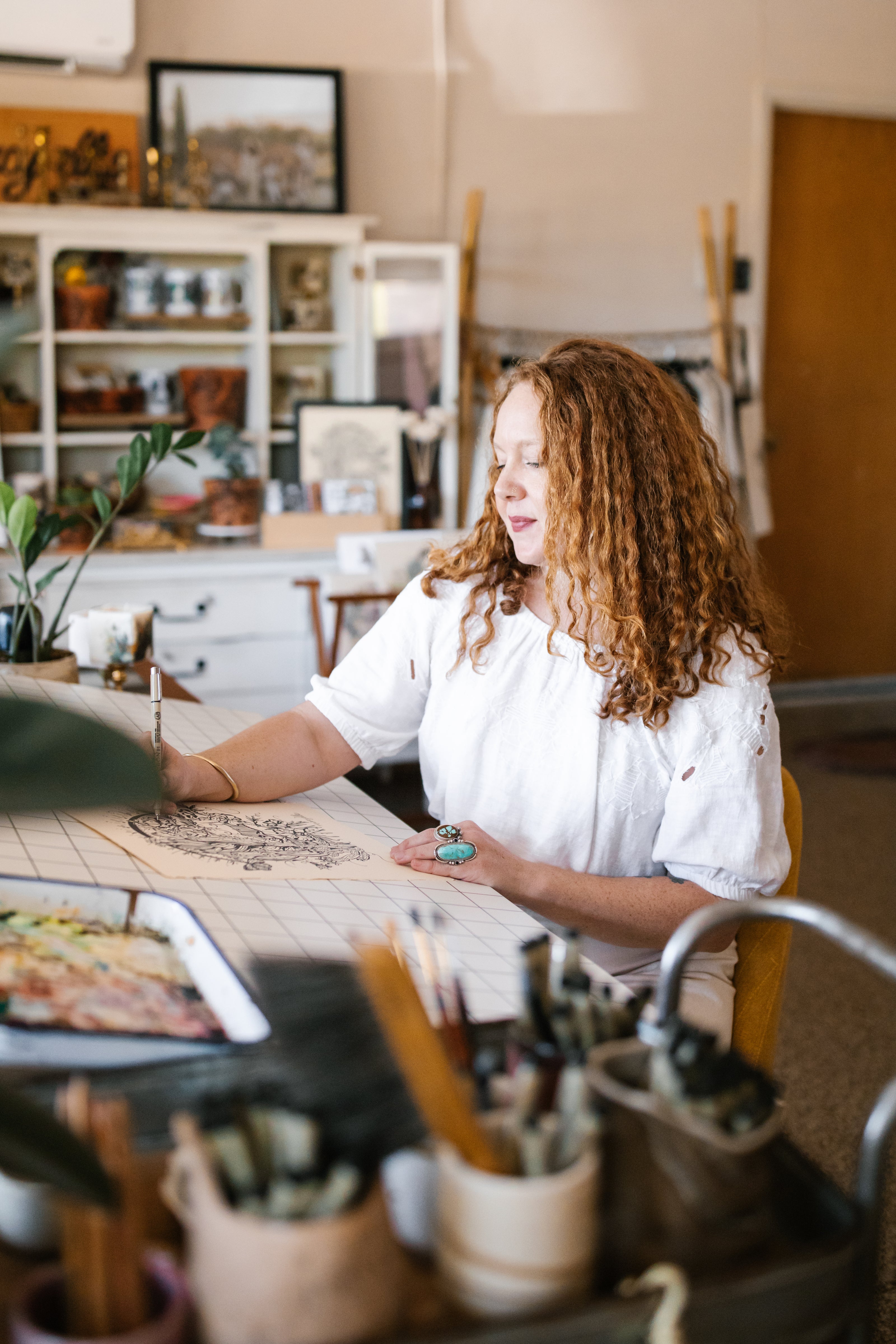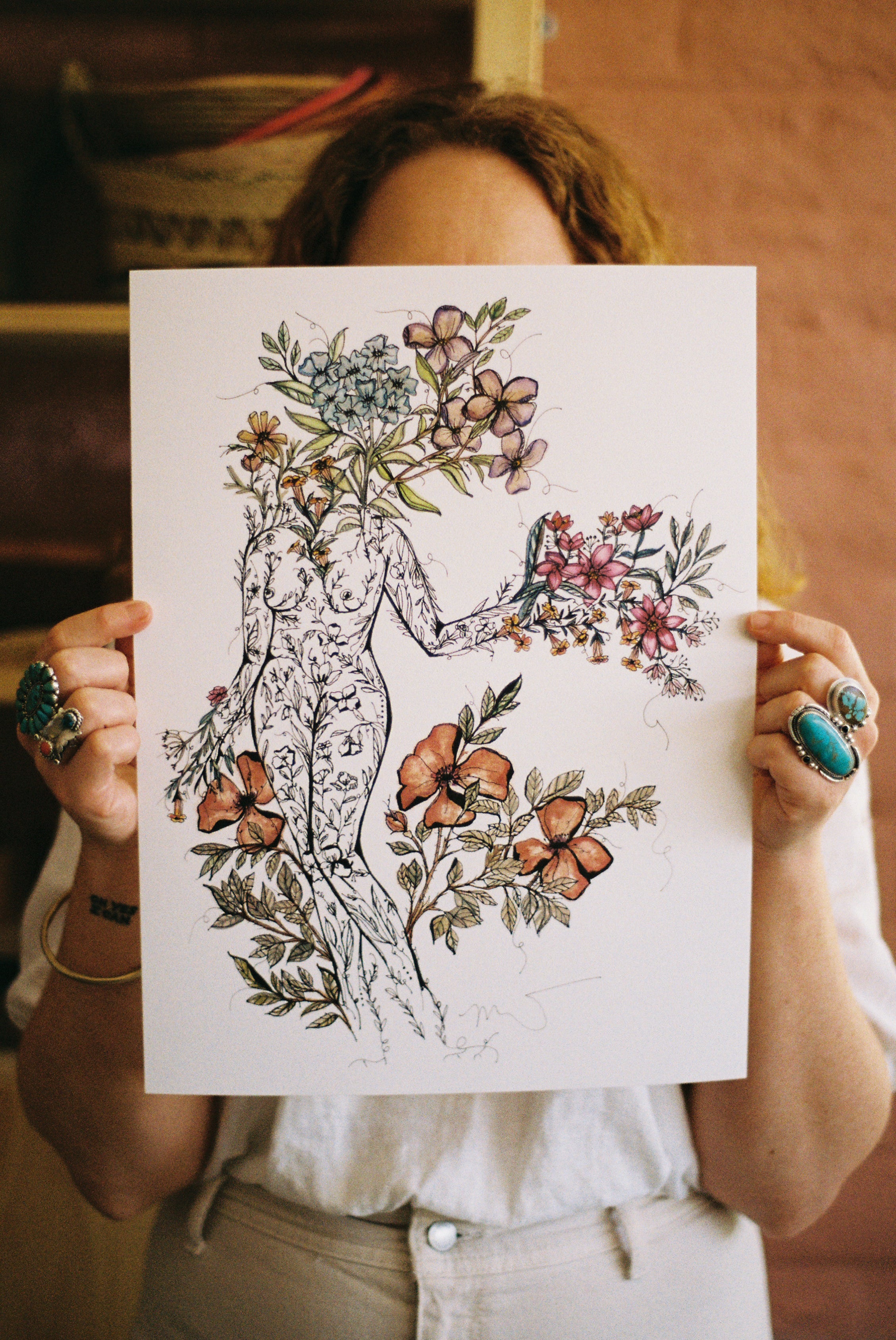 Marcy Ellis is a multimedia artist inspired by the natural world and the connections to self, spirit, and sisterhood. her artwork spans various mediums, including fine art prints, apparel, murals, ceramics, tattoo designs, and body painting.