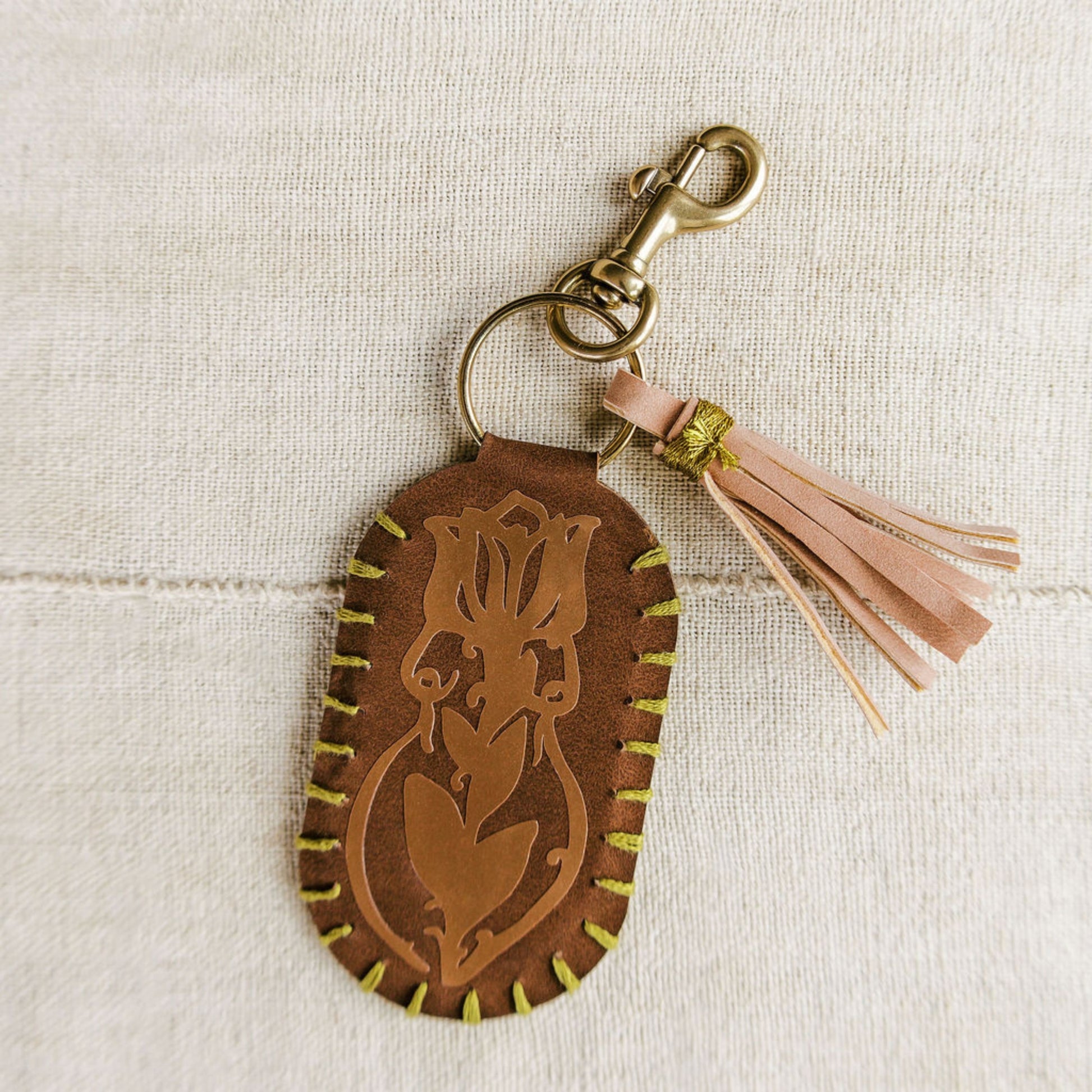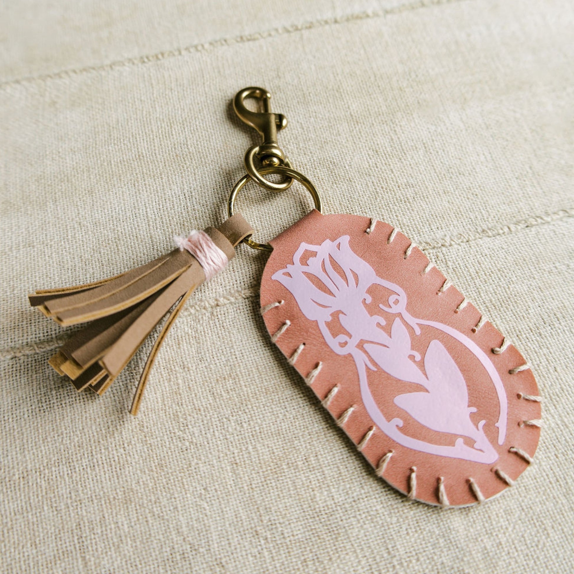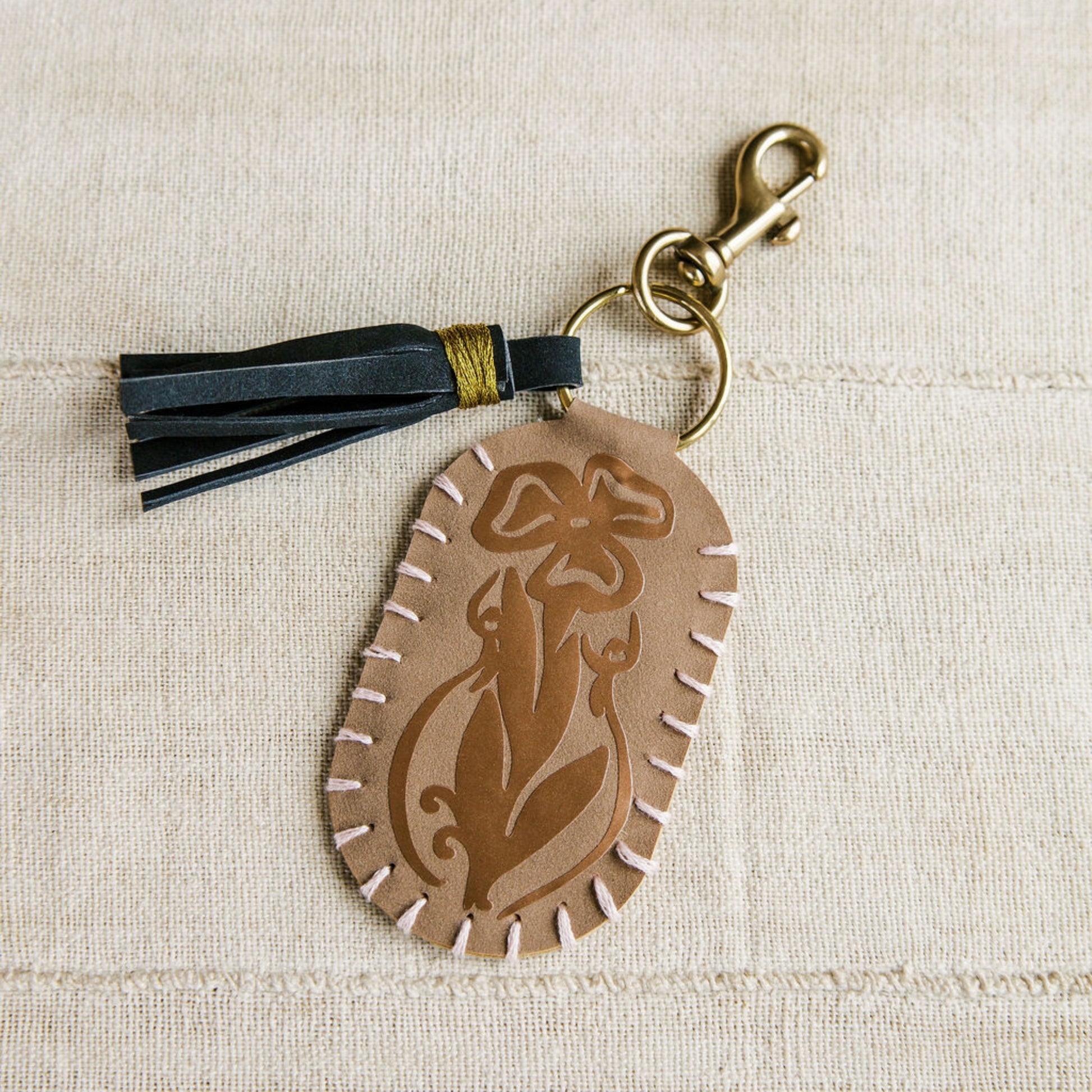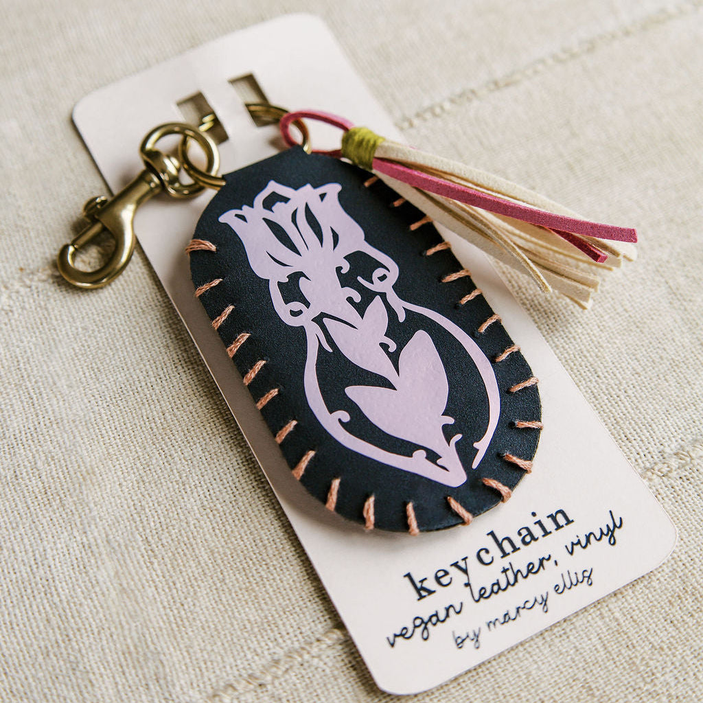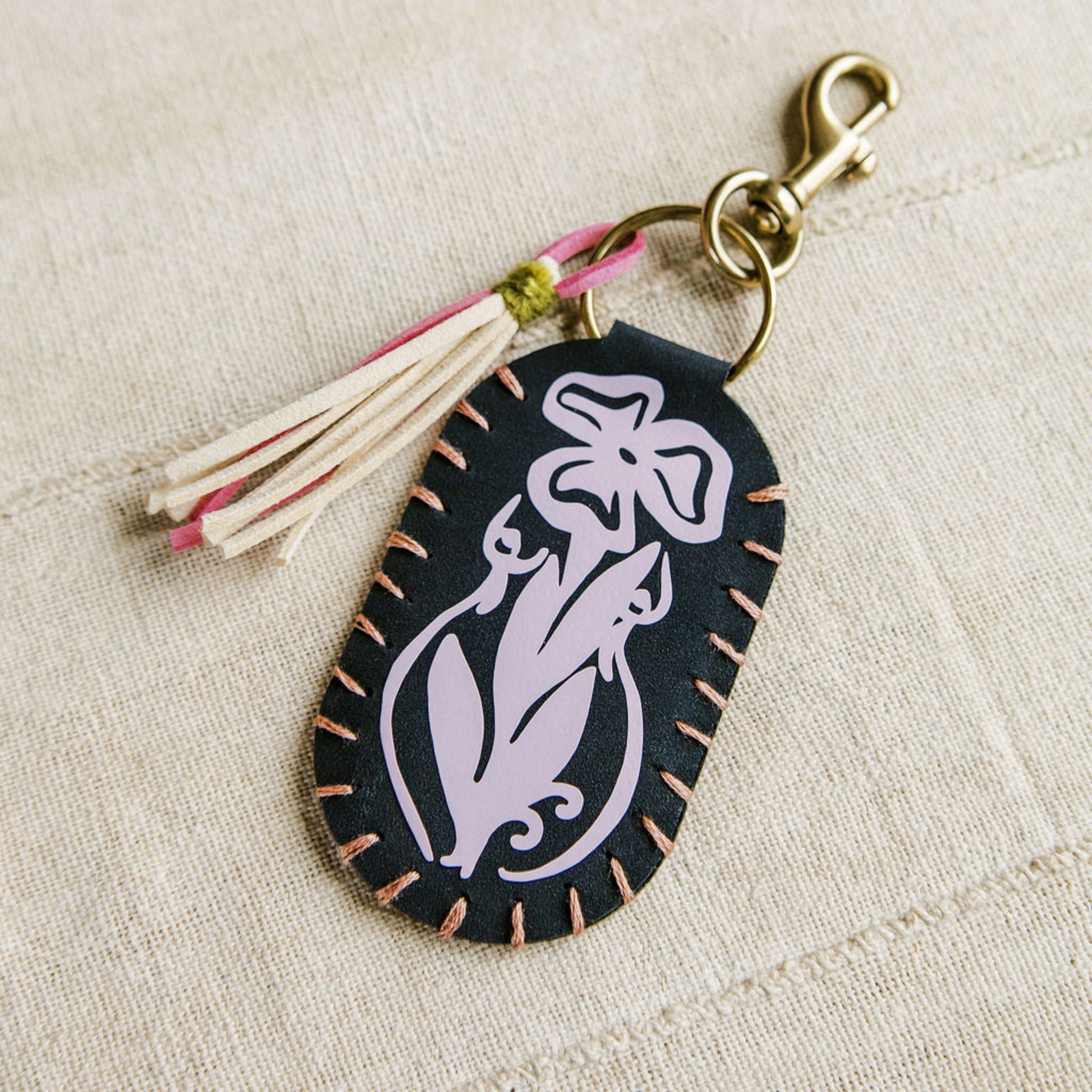 - Flora Sisters Vegan Leather Keychain is double sided featuring a different vinyl image on each side, paired with handmade tassel. pick your choice of vegan leathers: pink, tan, black or brown