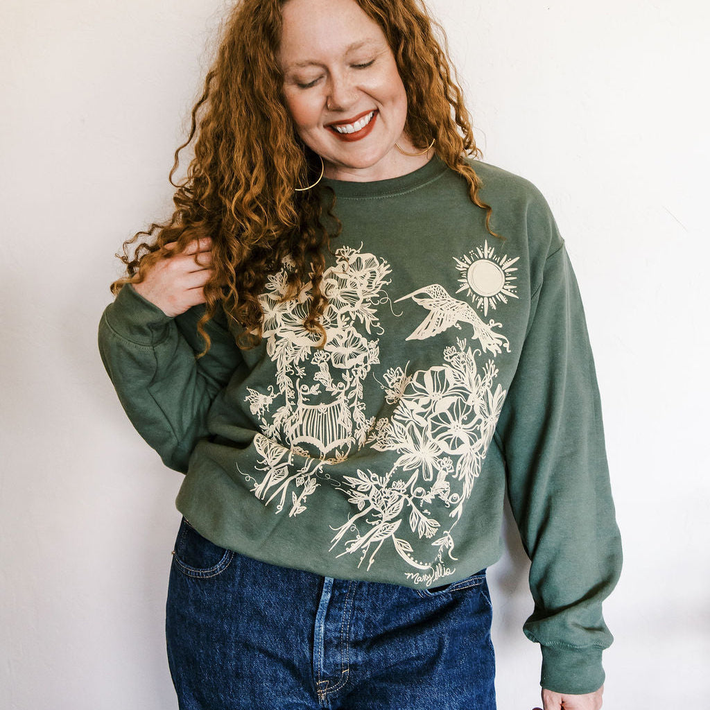 your new favorite sweatshirt to carry you through the colder season. the Hummingbird Sister sweatshirt is a vibrantly screen printed illustration on a classic unisex sweatshirt from Gildan’s Heavy Blend collection in military green color. a classic fit, seamless body, and 1x1 ribbing with spandex for stretch and recovery, it's super cozy and perfect for layering or wearing on it's own.
