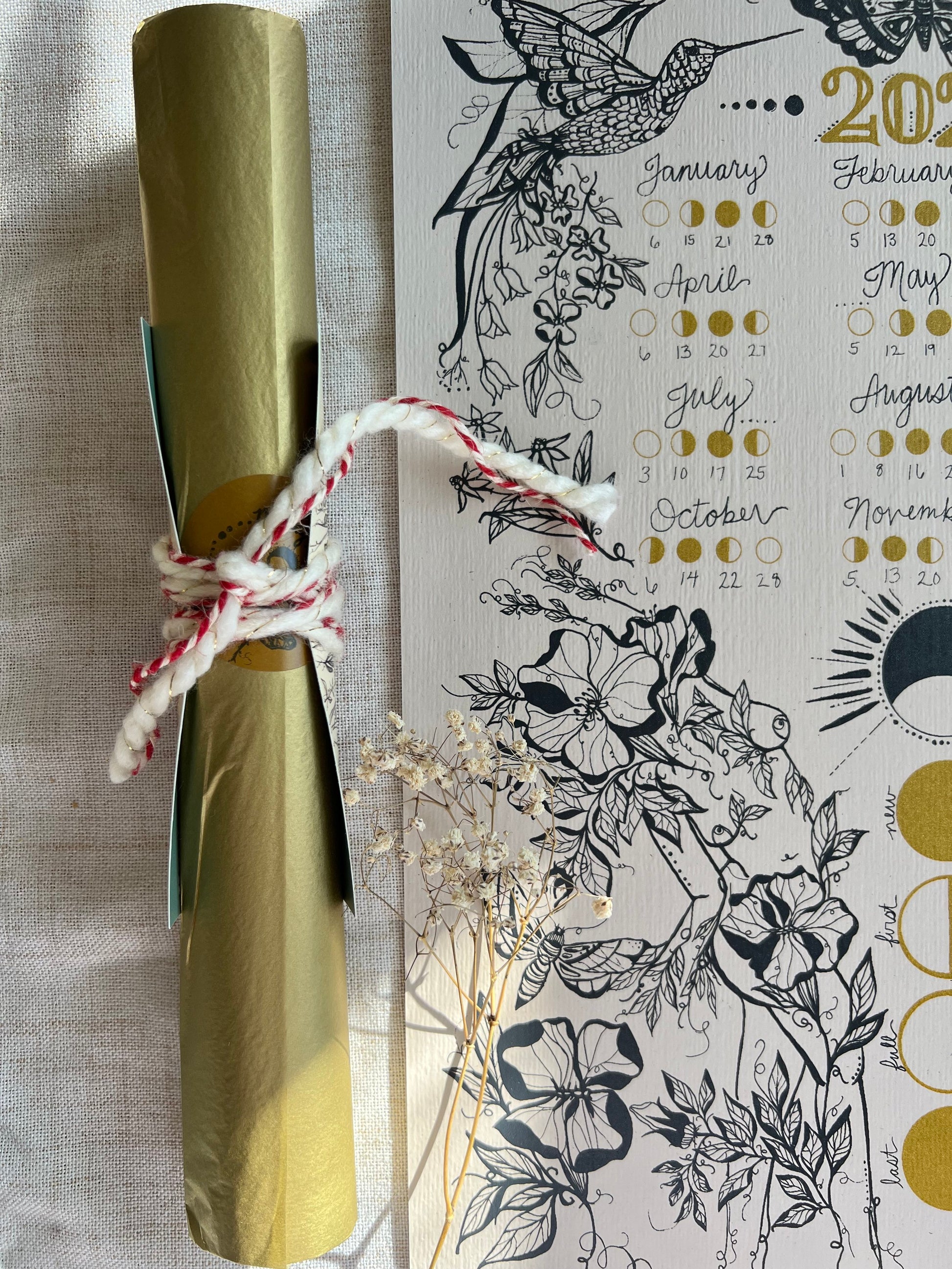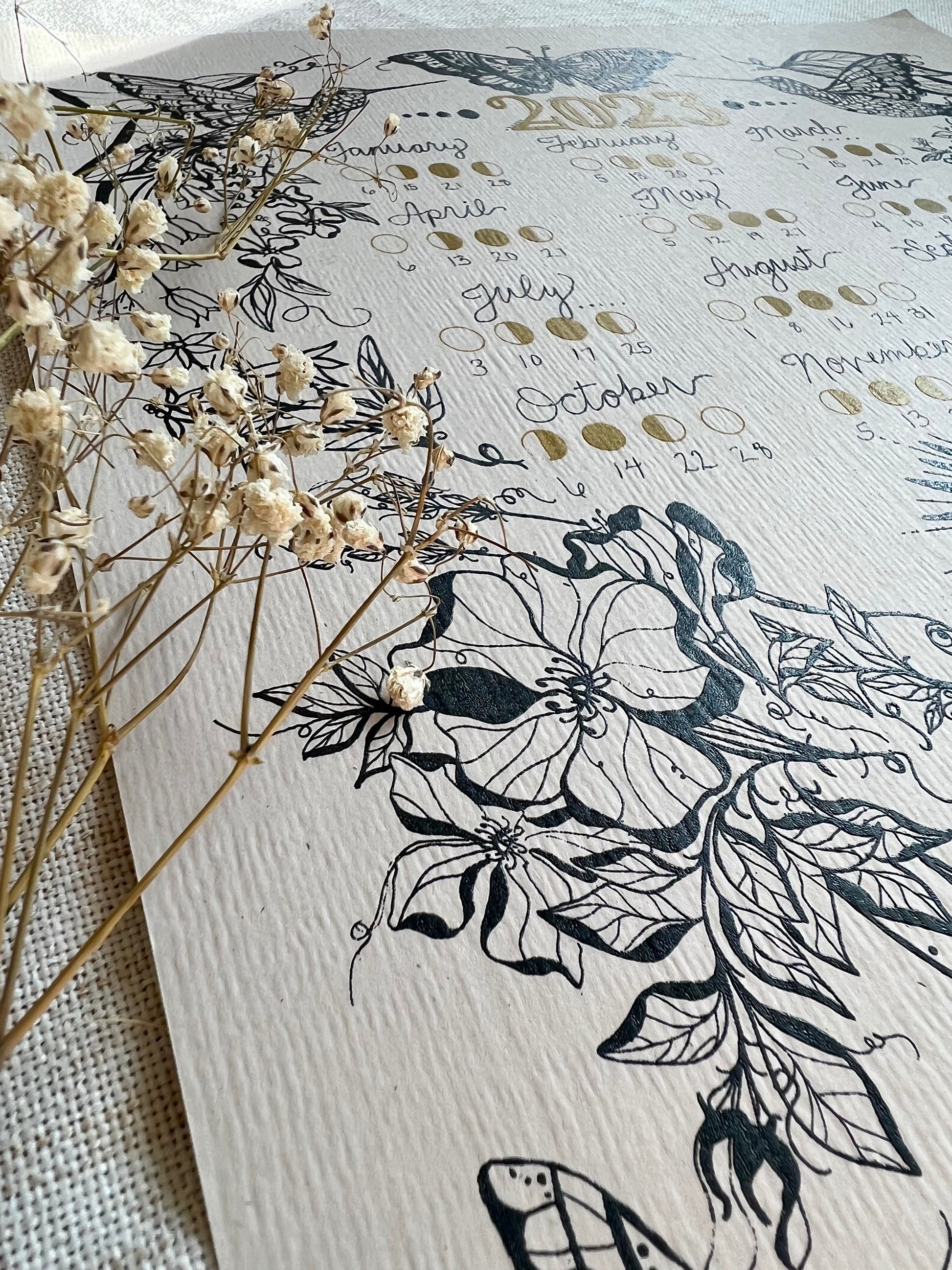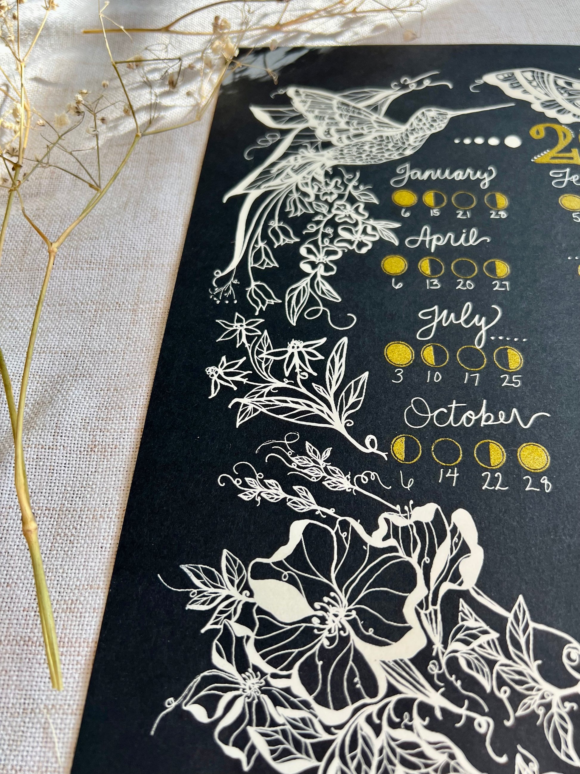 - printed on sturdy, 80lb paper in two color options: black paper, sturdy 80lb thickness with cream colored images, months and dates with vibrant gold colored moons and year. and off-white, sturdy 80lb thickness with black colored images, months and dates with vibrant gold colored moons and year.