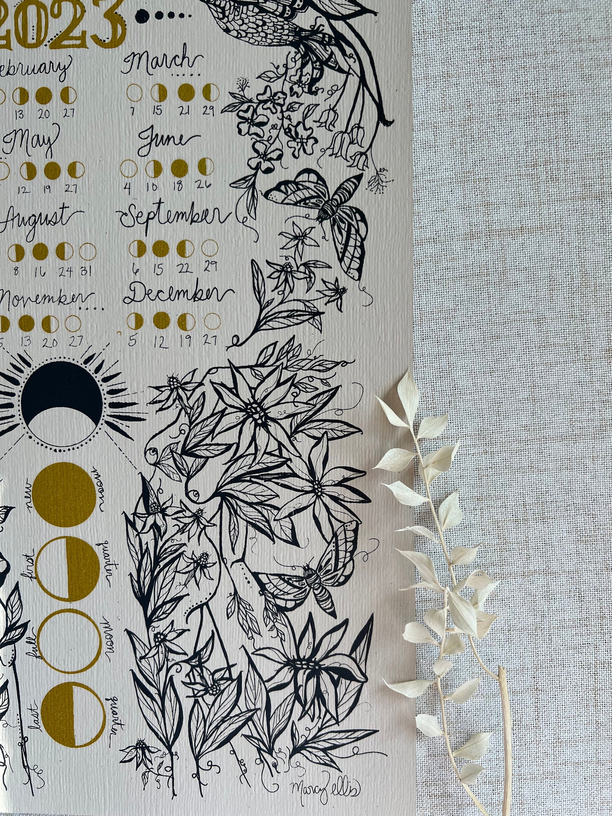 adorn your walls with this mesmerizing moon phase calendar! for five years, artist Marcy Ellis has created a lunar calendar to inspire and guide you through the year. use it to plan and align with the lunar cycles. a work of art to display for months and years.