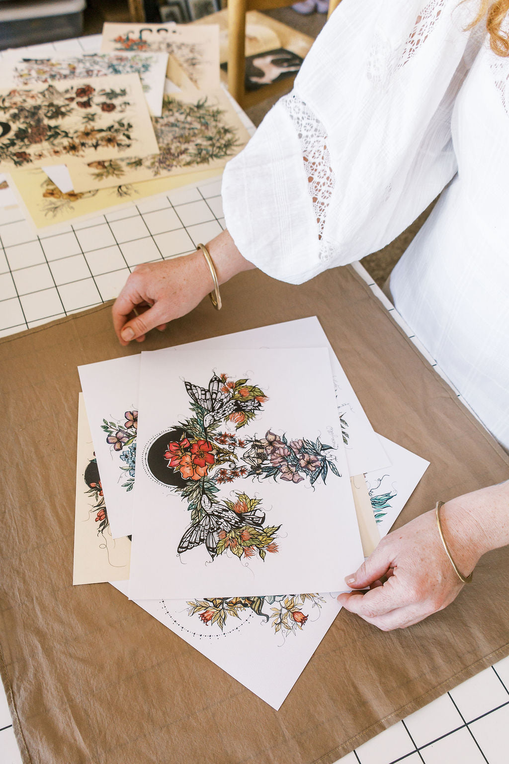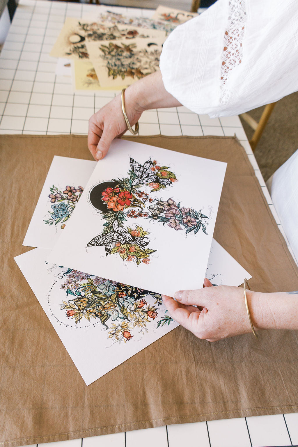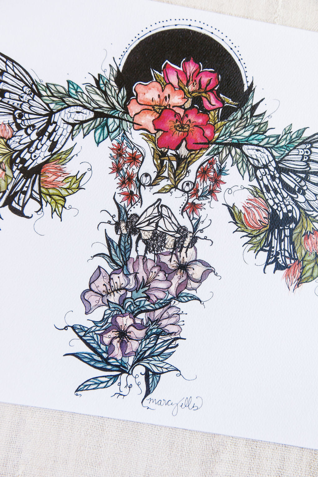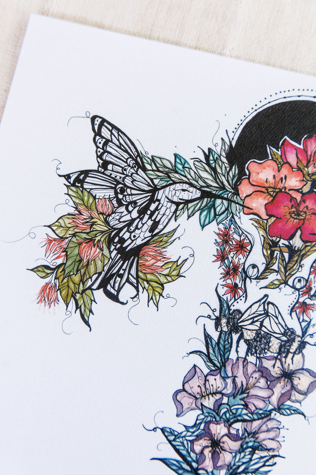 My Power is a fine art print painted in earthy, vibrant watercolors with delicate hand-drawn ink details on a white background. inspired by feminine strength and the sacred power of the womb, this artwork features a blooming figure surrounded by graceful hummingbirds and radiant florals beneath the glow of the moon.