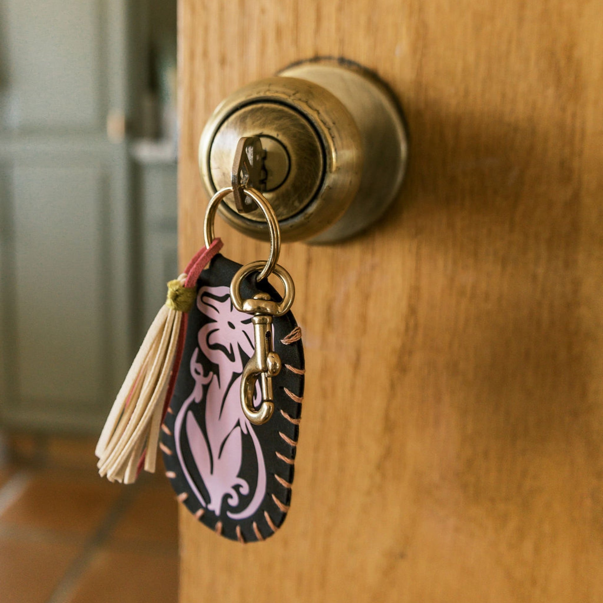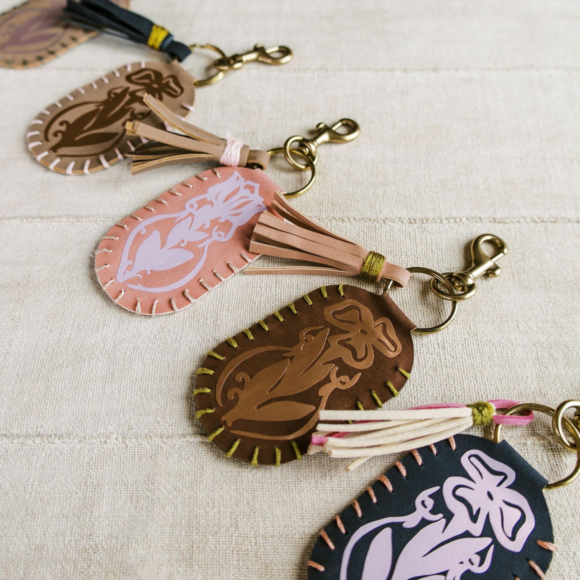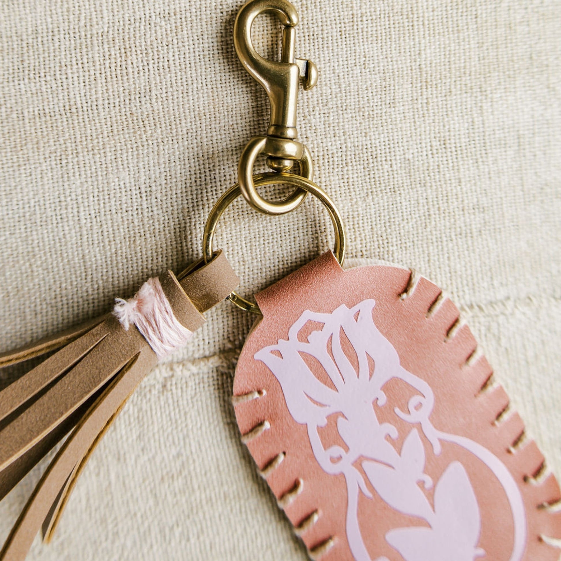 handmade keychains crafted from soft vegan leather, hand-stitched, and finished with a delicate Flora Sister vinyl illustration. each piece is double-sided, featuring a different design on both sides. hand-made tassel and brass key ring with swivel clip make it easy to attach to your keys, bag or zipper pull.